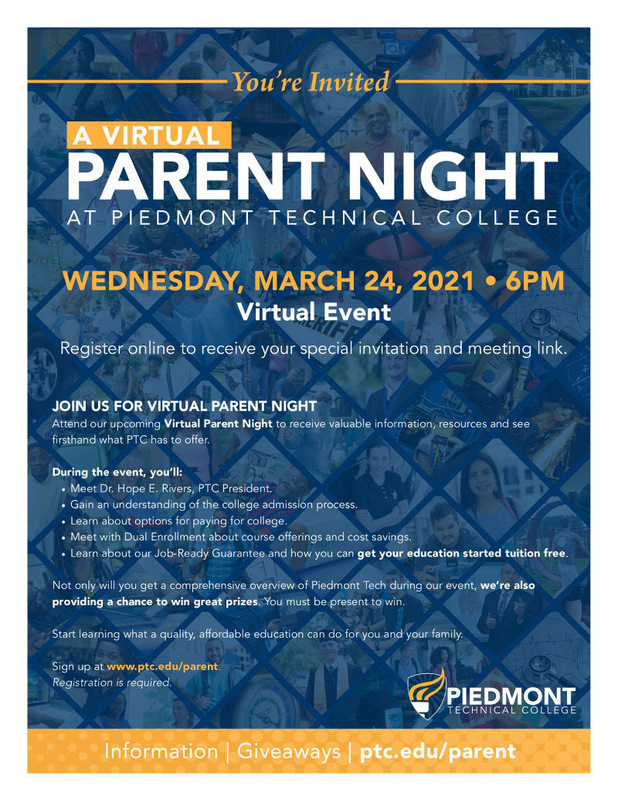 Piedmont Tech is hosting a virtual parent night on March 24th at 6pm.  For more detailed information on how to register, please see the attached flyer.