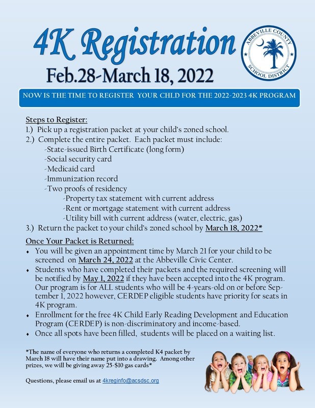 4K Registration has opened! Please refer to the attached information sheet that gives details on what you may need to bring to get your child registered. For questions, please email at 4kreginfo@acsdsc.org.